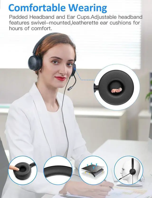 COMFOTR DESIGN: The USB headset with soft and padded ear muffs cover on both sides ensures lasting comfort. Adjustable headband features swivel-mounted, leatherette ear cushions. The stainless steel slider helps you to find the fit and provides durability.