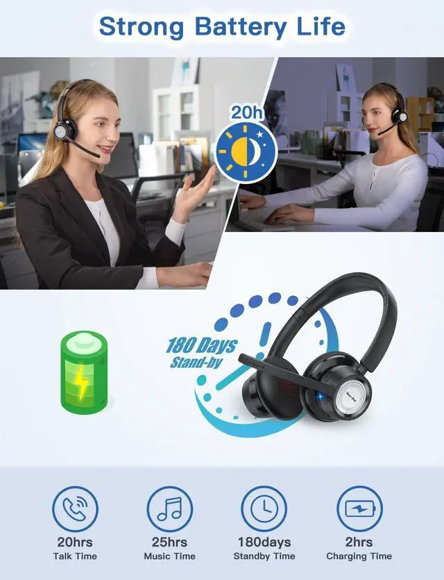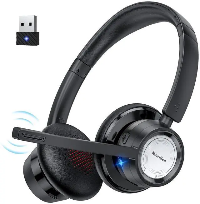 Noise Cancellation & Mute FunctionNew bee BH58 Bluetooth headphone adopts advanced ENC Noise Reduction Tech which can filter out 99.6 % of background noise automatically while you are on a call, leading to a ultra-clear calling experience. With the mute key, you can click the mute button to easily turn the microphone ON/OFF during the calls (for cell phone and computer). ^^ Bluetooth V 5.0 & USB DongleThe Bluetooth V 5.0 technology brings ultra-fast wireless transmission and stable connections, which widely compatible with most computers, laptops, smartphones, tablets. For devices without Bluetooth function, you can use the USB dongle to connect trucker Bluetooth headset with the device.