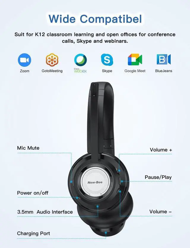 ^^ Long Battery Life & All-Day Comfort The BH58 wireless headphones supports up to 28 hours of continuous music playtime and more than 400 hours of standby time with only 1.5 hours of full charge time. ultra-light and soft protein memory foam ear cushions and an adjustable headband. No binding pressure when wearing for all-day comfort. ^^ Widely CompatibleThe wireless headset for computer widely compatible with most computer/laptop/pc/cell phone and other devices, no need of installation. It is designed for VoIP/webinar/Skype/Zoom/Avaya/Call Center/online meetings/Home/Office. ^^ Excellent After-Sales Service New Bee provides excellent after-sales service, 12 months warranty from the date of purchase, professional technical team and customer service center are standing by.