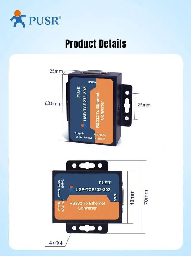 PUSR TCP232-302 TCP IP to Serial Support DNS DHCP Modbus Gateway Device Server RS232 to Ethernet Converter