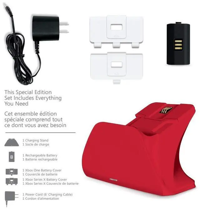 Play like a pro. Expand your collection accessorize in style. Complete your gaming set up and Dock your Controller on your matching charging Stand. This Xbox Pro charging Stand is a Premium, high performance and seamless charging experience for gamers. Charge quickly in under 3 hours - with overcharge protection to prevent overheating and short circuiting! Never worry about faulty connections with a magnetized battery cover that creates a secure connection. Compatible with Xbox One X, Xbox One S, Xbox One, and Xbox Elite Controllers. Not compatible with the Xbox Elite series 2 contains (1) charging Stand, (1) 1100 mAh rechargeable battery pack, (1) Xbox series x battery cover, (1) Xbox One battery cover, (1) 6 foot long power cord.