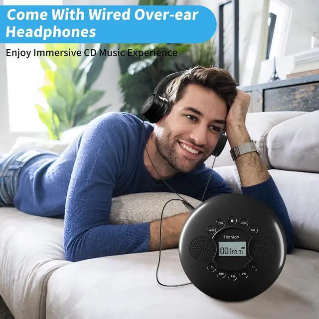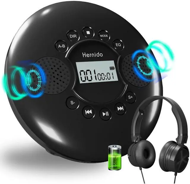 CD PLAYER WITH SPEAKERHernido portable CD player with dual stereo speakers, support 5 EQ sounds--BBS, POP, JAZZ, ROCK, CLASSIC. Compatible with standard CD/CD-R discs, MP3 CD discs, and HDCD discs. you can enjoy your favorite CDs music perfectly at home, in the car, or on the travel. ^^ RECHARGEABLE CD WALKMANThis CD player portable can used for 4-5 hours per charging with build-in 1200mAh rechargeable battery. Come with durable and foldable headphoes, soft plush headband and big comfortable ear cushions blocks ambient noise for comfortable CDs music listening experience.