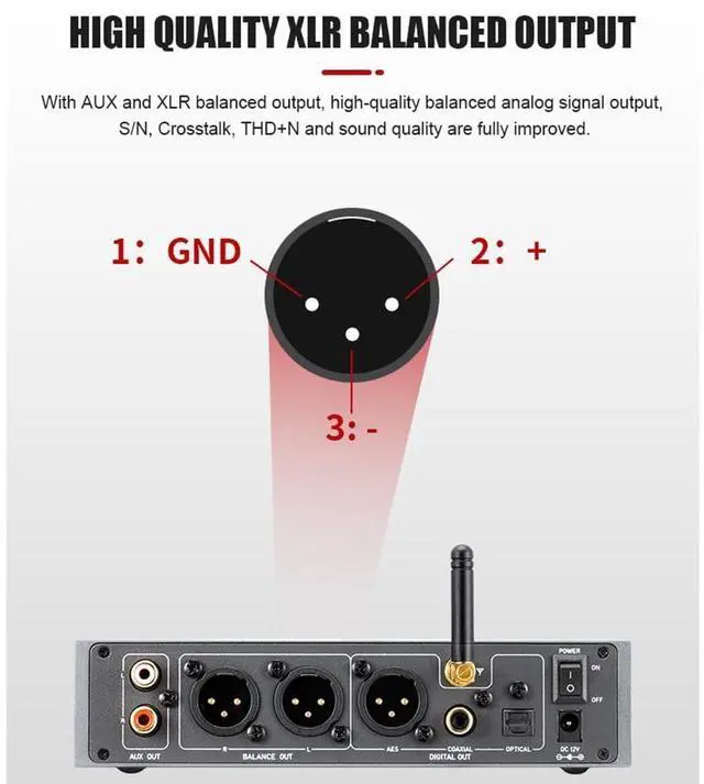 High-Quality XLR Balanced Output: The device includes both AUX and XLR balanced outputs, which significantly improve signal-to-noise ratio (S/N), crosstalk, and total harmonic distortion plus noise (THD+N), providing crystal-clear audio for audiophiles.