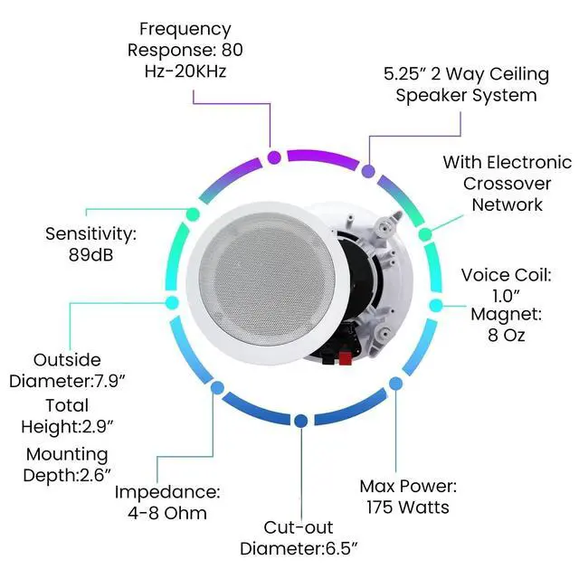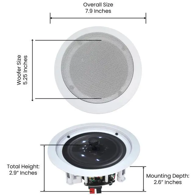 ^^: Technical Pro Bluetooth Receiver is compatible with Bluetooth w/ 30 ft wireless range and works w/ todays latest devices including smartphone, iPad, tablet, iPhone and laptop w/ hassle-free receiver pairing ^^: The speaker sound amplifying device has crisp buttons for the audio sources and selectors, rotary knob for equalization and master volume adjustments. It also features blue LED illuminated buttons and knobs for high visibility ^^ -: The pair of 5.25 Inch High performance in-ceiling stereo sound speaker has two way of installation: in-wall or in-ceiling flush mount. It has convenient speaker terminals that allow for quick and hassle-free speaker wire connection at any custom installations ^^: A pair of flush mount design midbass stereo sound speaker for simple and easy in-wall / in-ceiling installation. The product features 1 Inch high temperature voice coil to produce powerful, rich sound or quiet background music