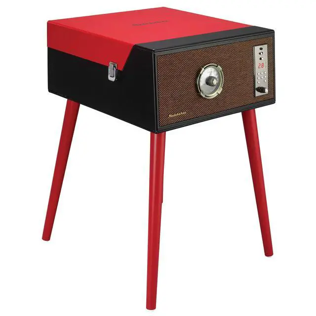 Studebaker SB6085RD Bluetooth Wireless Floor Stand Turntable 3 Speeds CD Player FM Radio With Built in Speakers (Red) A blast from the past! This floor stand turntable is sure to be a conversation starter. Play your classic vinyl on this 3 speed belt driven turntable with a full sized platter, plastic tone arm with ceramic cartridge and 2 built-in speakers with total output of 6W RMS. Other features include Bluetooth connectivity for streaming music, a CD player hidden away inside the platter and an FM analog radio. You can put this turntable on a table or attach the 4 wooden legs and stand it on the floor.