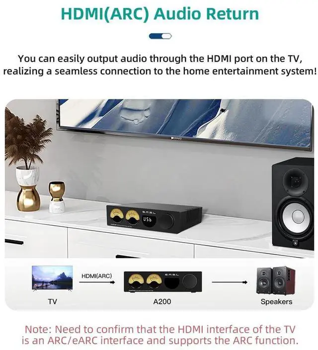 Input Methods: The A200 audio amplifier supports Bluetooth, Optical, Coaxial, HDMI ARC, USB, and RCA inputs, providing flexible connectivity options to meet your diverse use of the scene ^^