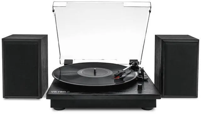 Victrola VM-135-BLK Montauk Bluetooth Turntable System with Speakers (Black) All In OneThe Victrola Montauk Bluetooth Turntable is everything you need in a record player shelf system. The Montauk features a 3-speed, belt driven turntable capable of playing all your favorite vinyl records and easily connects to the included pair of shelf speakers for a true stereo listening experience. Listen Your WayAn RCA output allows you to connect the Montauks turntable to any external speaker, or stream music from your smart device to the shelf speakers using wireless Bluetooth connectivity. The Montauk sports a smart, natural wood finish and a modern design that fits perfectly in any listening space, the perfect turntable system for your home.