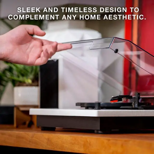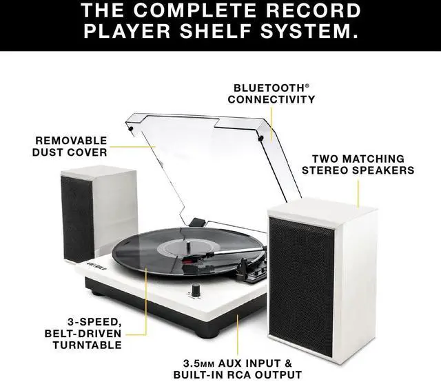 Features & Benefits: 3-speed, belt driven turntable plays all your favorite 33 1/3, 45, and 78 RPM vinyl records Warm, natural wood finish with matching pair of stereo speakers Bluetooth connectivity allows you to stream wirelessly from your smart device Built-in RCA out and 3.5 mm aux-in Removable, acrylic dust cover keeps your records dust and scratch freeSpecifications: POWER