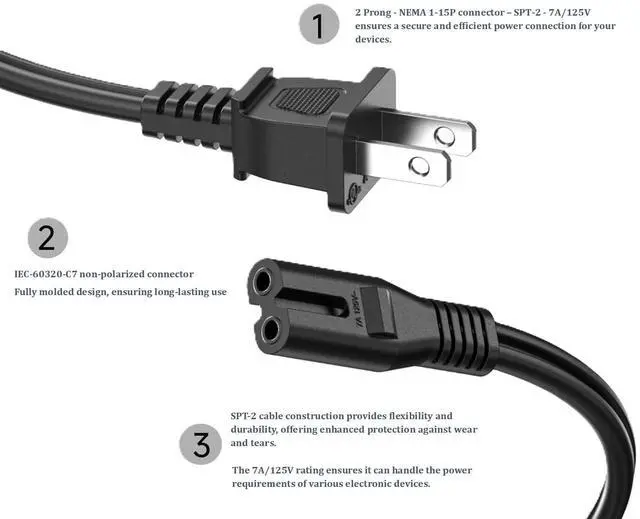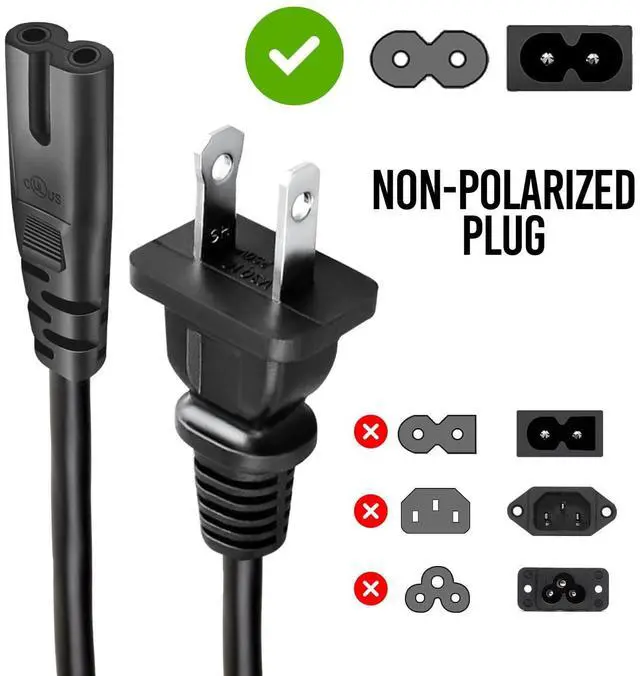 NON POLARIZED POWER CORD: Connect your battery chargers, laptop power supplies, AV equipment, video game consoles, and other equipment, features a nonpolarized IEC 60320 C7 plug on one end and a nonpolarized NEMA 115P 2prong ^^