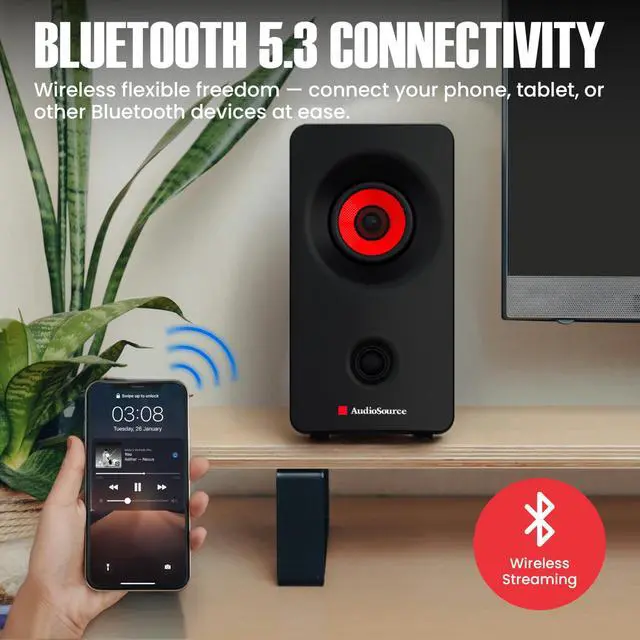 At just 3.5" x 6.6" x 3.9", they blend into your workspace while elevating your sound. ^^ Enhanced Connectivity with Bluetooth 5.3 Switch effortlessly between wired and wireless listening. Stream music or videos from your laptop, tablet, or phone with Bluetooth 5.3, offering a stable, low-latency connection for smooth audio every time. ^^ Smart Energy-Saving Auto Shut-Off Thoughtfully engineered with low power consumption (< 0.5W ) and auto shut-off, these speakers help conserve energy when not in useideal for long days at the desk or overnight standby.