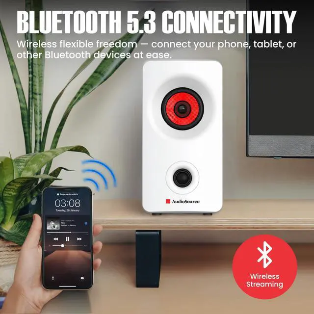 At just 3.5" x 6.6" x 3.9", they blend into your workspace while elevating your sound. ^^ Enhanced Connectivity with Bluetooth 5.3 Switch effortlessly between wired and wireless listening. Stream music or videos from your laptop, tablet, or phone with Bluetooth 5.3, offering a stable, low-latency connection for smooth audio every time. ^^ Smart Energy-Saving Auto Shut-Off Thoughtfully engineered with low power consumption (< 0.5W ) and auto shut-off, these speakers help conserve energy when not in useideal for long days at the desk or overnight standby.