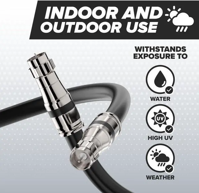 Outdoor Use: This RG11 coax cable is engineered for use both inside and outside, and includes weather-stabilized and UV-coated connectors and a PVC outer jacket.