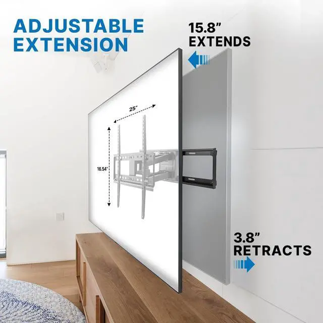 ^^ ADJUSTABLE EXTENSION: This full-motion wall TV mount lets you extend it up to 15.8 inches for the perfect viewing angle or retract it to just 3.9 inches for a sleek, space-saving look that will enhance your home aesthetics. ^^