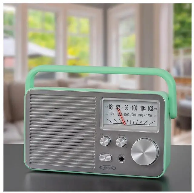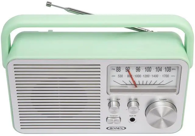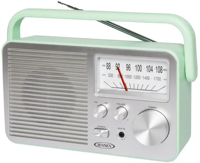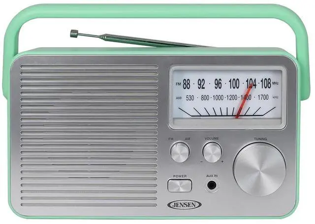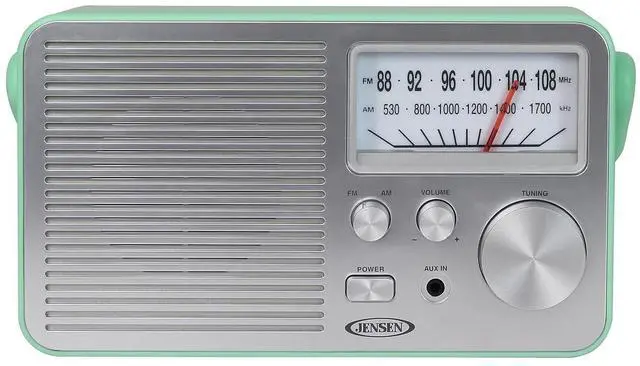 Never miss your favorite game, listening to your favorite radio station, or catching up on the latest news with this JENSEN MR-750 Portable AM/FM Radio. The stylish Green radio can go anywhere you go and you'll find its large analog tuning dial makes setting your favorite station a breeze. You can also play music from an MP3 or other digital media player using the front mounted aux input jack. The MR-750 also includes a built-in speaker, folding handle, and FM antenna. The unit operates on 120-volt AC power or on 4 C batteries (sold separately).