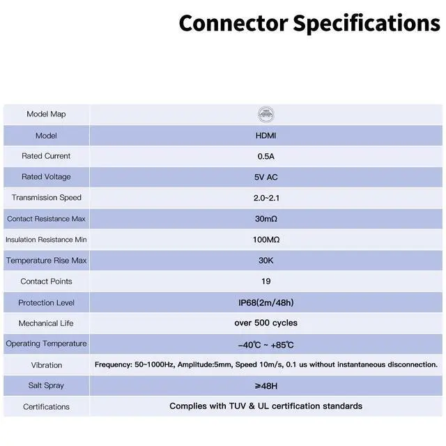 : It handles 0.5A current, AC 5V voltage. HDMI 2.0 - 2.1 18Gbps transmission rate. Contact resistance is 30m, insulation resistance is 100M. Support temperature risk max 30K for efficient and stable connections.