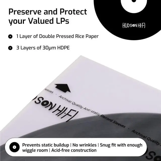 THE ULTIMATE ALBUM SLEEVES FOR YOUR PRECIOUS VINYL RECORDS ARE HERE! Now you can finally protect your valuable LPs from scratches, scuffs and dust with the Hudson Hi-Fi exclusive vinyl record outer sleeves! Keep your vintage record collection safe from dirt or tears effortlessly! ^^ MUST-HAVE RECORD ALBUM SLEEVES FOR EVERY SERIOUS LP ENTHUSIAST! You have spent a lifetime and a small fortune collection your rare vinyl records. Why not protect them from static electricity and messy accidents with our 3ml thick polyethylene exterior record disc covers? ^^ STORE, CARRY & ORGANIZE YOUR VALUABLE LPS LIKE NEVER BEFORE! Unlike all those cheaply made record protector sleeves, our durable and convenient LP outer sleeves will help you store your vinyl albums like a pro collector.