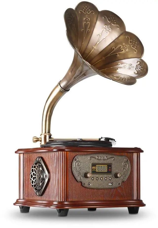 / Support Vinyl Record Of 7"/10"/12"Featured fine and sturdy wood base, this beautiful vintage phonograph is expertly handcrafted by highly skilled artisans with several processes. Its smooth lines with the hand-colored paint nicely detailed in all of the sides. The brass horn is riveted by 8 petals of brass by hand with the antiquated surface. ^^ Offering High Quality & Richer Stereo Sound - A 10W Tweeter and 2 x 20W Full-range Stereo SpeakersThe brass horn equipped with a 10W tweeter will maximally reproduce the realism of sound.