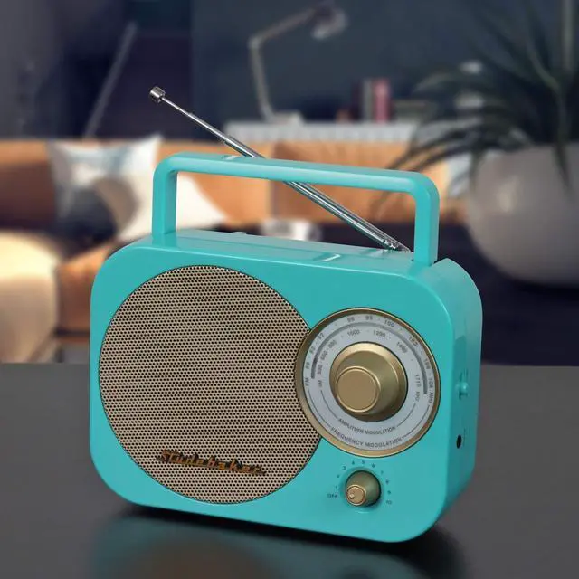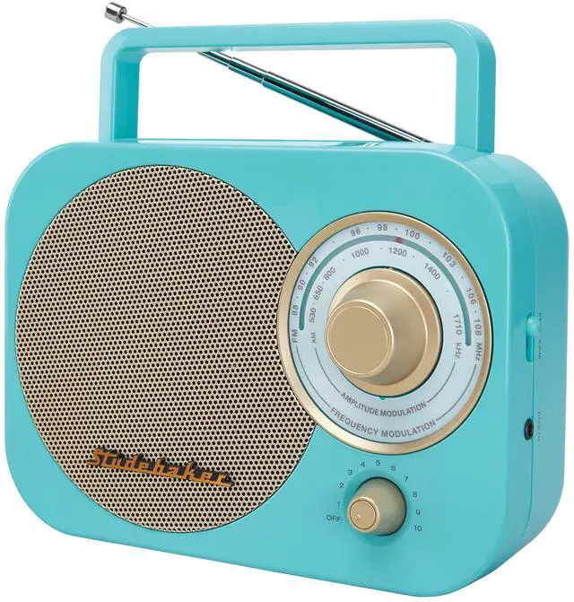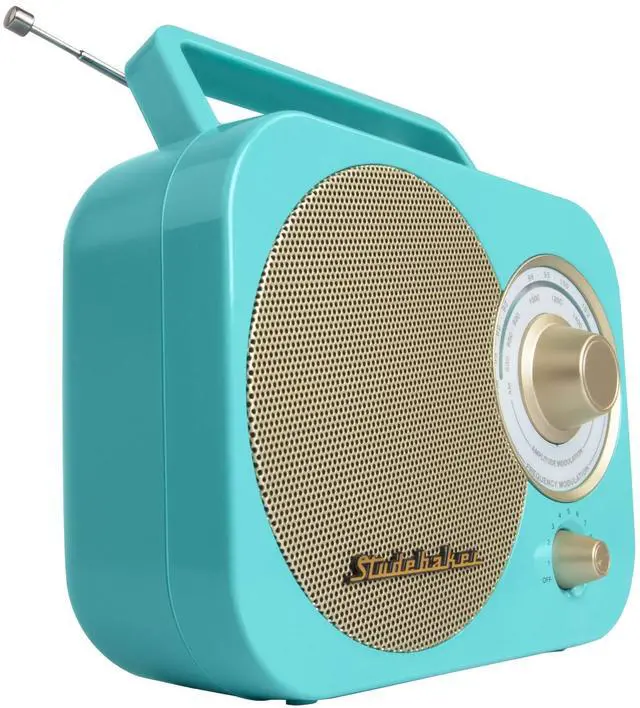 Studebaker SB2000TG Turquoise/Gold Retro Classic Portable AM/FM Radio with Aux Input Limited Edition The Studebaker SB2000 AM/FM radio is an retro portable radio with classic styling, and easy to use features. The large analog tuning knob simplifies adjusting to your favorite station and the speaker delivers excellent sound with clear and static-free audio. Play music from other devices like your tablet, iPod, MP3 player or other digital audio players using the built-in auxiliary input jack. The compact, durable design features a carrying handle and telescopic antenna. The SB2000 operates on 120V AC or on 4 x "C" batteries (not included), and makes the radio perfect for taking with you anywhere you go.