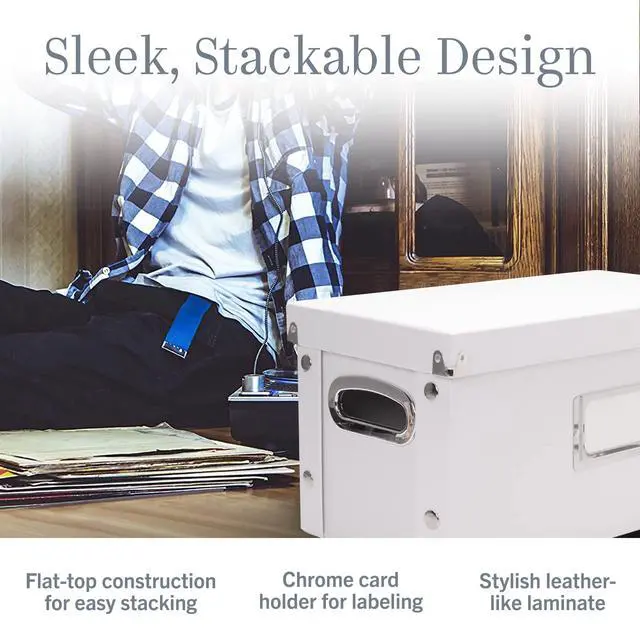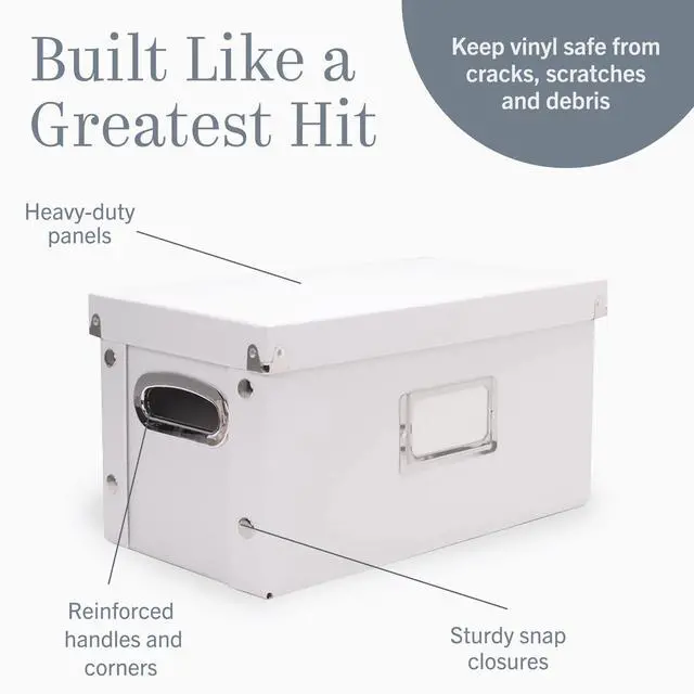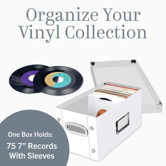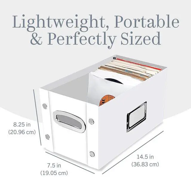 Store and organize your 45 records in this convenient storage box. Made of sturdy materials, the leather-like finish adds a stylish accent to any room. Each box has a capacity of 75 records in sleeves or in their original album covers and boxes can be stacked several high for the best utilization of space. This box features chrome snaps, corners, and a handle for durability and easy access. The patented design ships and stores flat but easily snaps together in seconds for use. Ideal for archival storage.