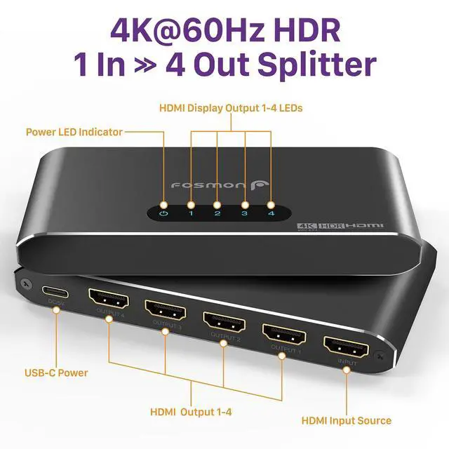 Fosmon HDMI Splitter 1 in 4 Out (4K@60Hz) 4 Port HDMI Splitter with EDID Down-Scaler for Dual Identical Display Support Compatible with PS5/4/3, Xbox, Nintendo, Switch, Roku TV, Fire Stick