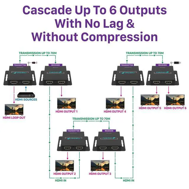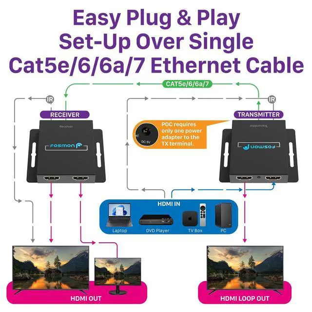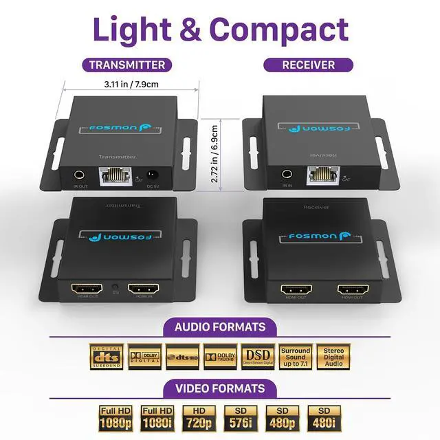 Transmitter features HDMI loop-out for 1 in 3 out setups. Versatile applications for home, office, gyms, bars, classrooms and meeting rooms. ^^ [ZERO-LOSS TRANSMISSION FOR PRISTINE VISUALS] Fosmon HDMI extender delivers 1080P@60Hz, 3D support with zero compromise on image quality over CAT5e/6/7 cables. Experience immersive audio with support for DTS-HD, Dolby TrueHD, and more. Ideal for education, LED displays, video conferences, and home theaters. ^^ [IR REMOTE CONTROL EFFORTLESS CONTROL] Simplify device control with the IR transmitter linked to HDMI transmitter and IR receiver connected to HDMI receiver.