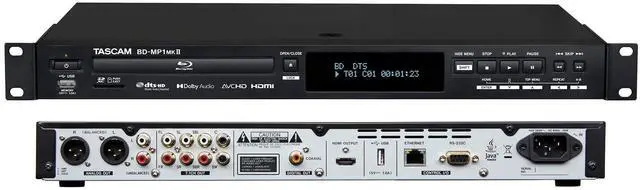 The TASCAM BD-MP1MK2 is a professional-grade Blu-ray player that expands the legacy of TASCAMs popular BD-01U and BD-MP1 Blu-ray players. The BD-MP1MK2 is the perfect choice for a wide range of high-end residential and commercial installations, including public, educational and commercial facilities, theaters, amusement and entertainment businesses, to name a few. ^^ DVD/CD, SD Card and USB