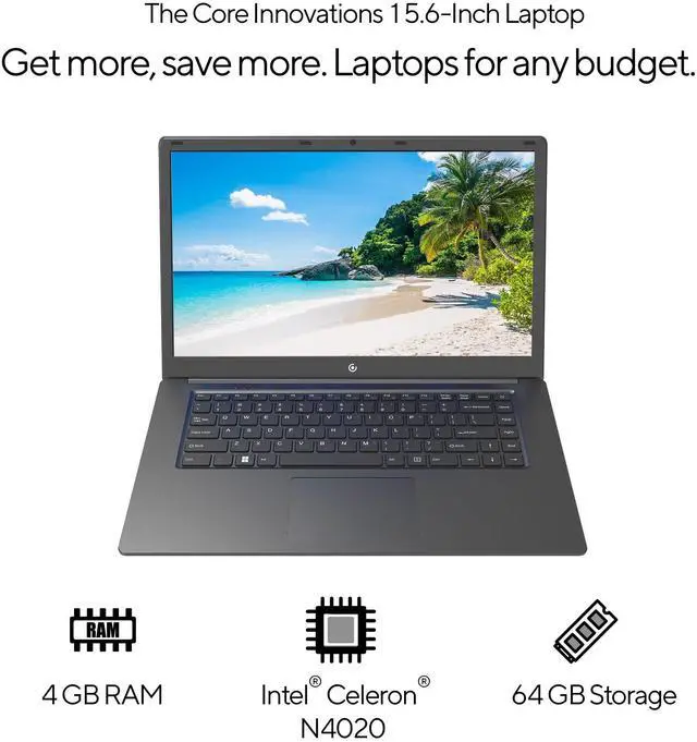 The Core Innovations 15.6 -inch laptop (Black) features a beautiful 1080p display that brings a crystal clear picture to all your tasks, games, movies and more. Windows 11 enhances security and performance while providing a familiar Windows experience. With an Intel Celeron processor N4020 4GB of RAM and 64GB of flash storage, the CLT2156BL lets you post, browse, work and play with ease. Connect your laptop to external devices via the mini HDMI output, and take advantage of the dual USB ports. And it all packs into a slim, lightweight frame, so you can bring your laptop along on all of lifes adventures.