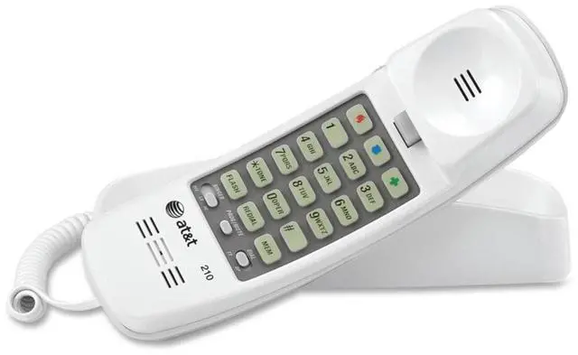 - This white AT&T 210 Corded Trimline Phone with Speed Dial and Memory Buttons is ideal for those who enjoy the convenience of a home phone. - Easy to place on an end table or countertop surface or mount on the wall this Trimline Telephone has several