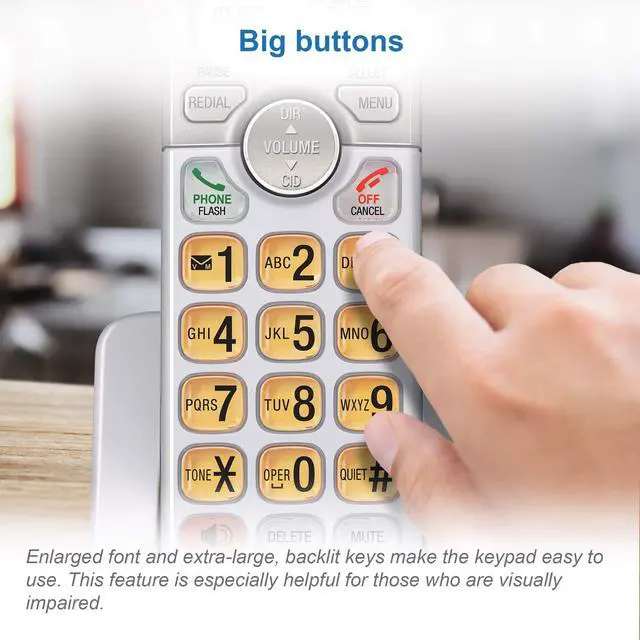 Expandable up to 5 handsets (uses 50003 accessory handset). Enjoy a speakerphone that can keep up with your calls. Increase participation by allowing both ends to speak and be heard at the same time for conversations that are more true to life. Extra large display for easy viewing Easy-to-read LCD on the cordless handset. High-contrast black text on a white background provides for an easy-to-read screen to view incoming Caller ID or review call history. The lighted keypad also allows for easy dialing in low-light conditions. Big Buttons Enlarged font and extra-large, backlit keys make the keypad easy to use.