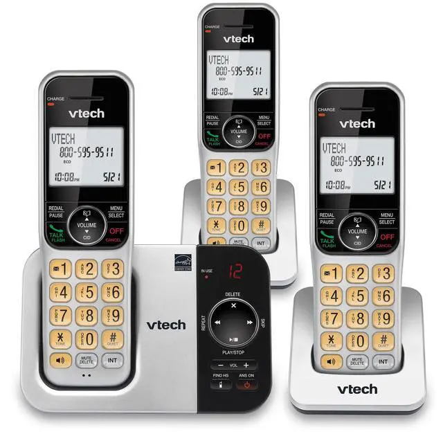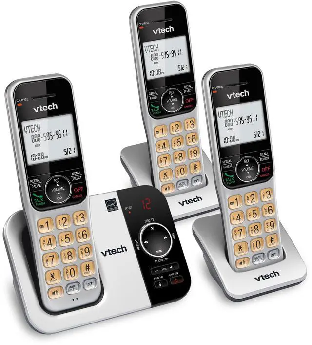 With up to 23 minutes of recording time, the VTech 3 Handset CS5329-3 Expandable Cordless Phone with Answering System and Caller ID grabs calls when you cant. The system also features a full- duplex handset speakerphone, which allows both ends to speak and be heard at the same time for conversations that are more true to life. Caller ID entries display on a large, backlit LCD screen so you can see whos on the line even in the dark. Plus, the lighted display indicates how many new messages you have waiting. Easily block up to 150 names and numbers with the Call Block.