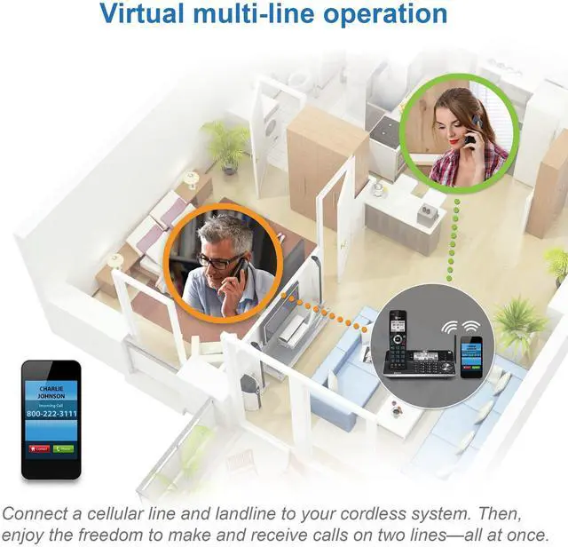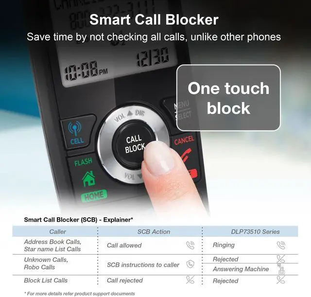 With the AT&T DLP73510 DECT 6.0 5-Handset Cordless Phone featuring, Unsurpassed, Range, Bluetooth Connect to Cell and Smart Call Blocker, you won't have to worry about unwanted calls waking you up in the middle of the night or tying up the line. Robocalls are automatically blocked from ever ringing througheven the first time. You can also permanently blacklist any number you want with one touch. Bluetooth Connect to Cell technology on the AT&T DLP73510 DECT 6.0 Cordless Phone lets you receive cell and/or landline calls from one home phone system. With a touch of a button, enjoy the high-tech benefits your smart phone offers.