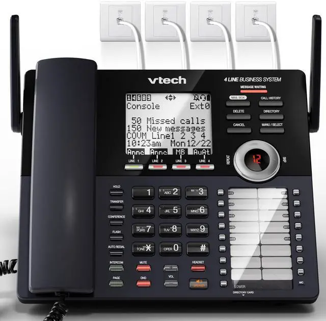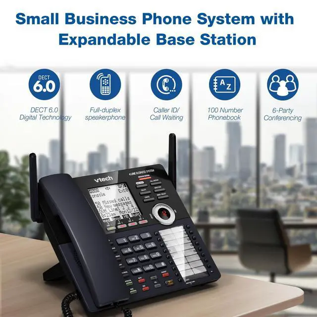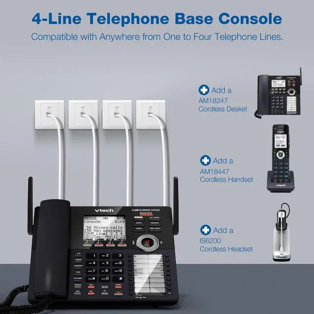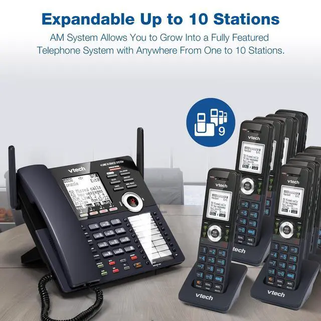 The VTech AM18447 Main Console serves as the core of a flexible, expandable cordless office phone systemideal for small businesses, home offices, or growing teams needing reliable multi-line communication. Compatible with the AM18247 Extension Deskset and AM18047 Accessory Handset, this system simplifies office connectivity. Only the main console connects directly to your analog phone lines (via RJ11) handsets and desksets pair wirelessly with one-touch DECT 6.0 technology for superior range, clarity, and interference-free performance. Set up your entire office in minutes without professional installation or complex wiring. Designed for growth, the AM18447 supports expansion up to 10 total stations (1 console + 9 extensions), allowing you to create a custom, fully featured telephone system as your business evolves.