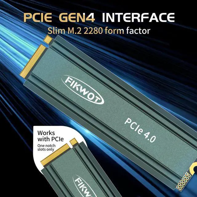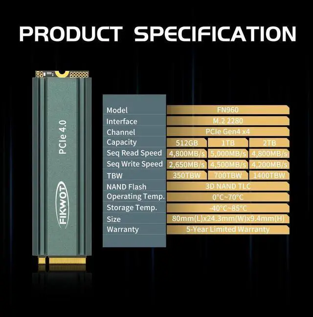 EXCELLENT PERFORMANCE - Fikwot FN960 1TB M.2 SSD adopts M.2 PCIe Gen4 x4 technology and is compatible with NVMe1.4 protocol. The maximum read speed of this SSD is as high as 5,000MB/s, and the maximum write speed is as high as 4,500MB/s. It is equipped with a dynamic SLC cache to effectively maintain the high-speed operation and stability of the SSD.