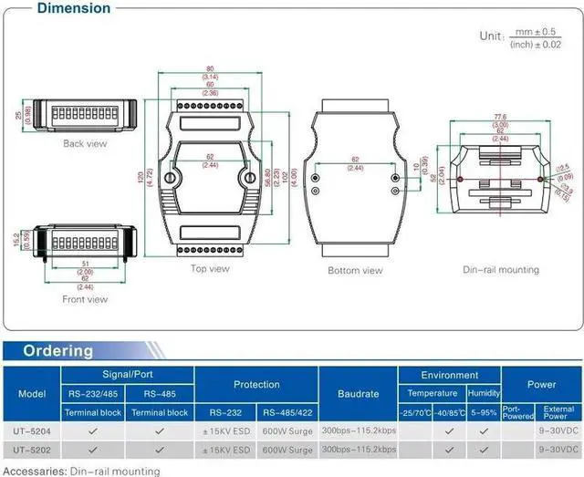 RS-232/RS-485 to 4 Ports RS-485 Hub (Din Rail)