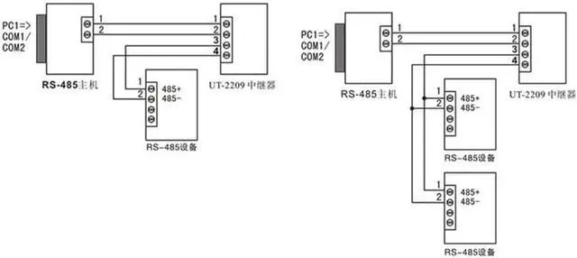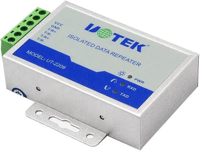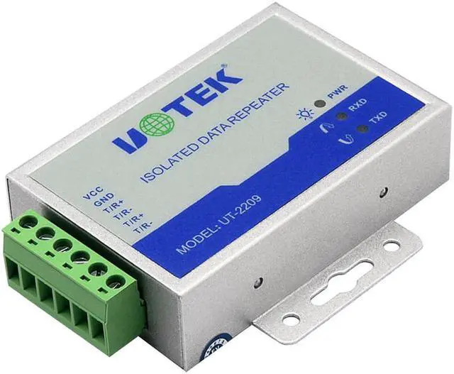 UT-2209 is a repeater with optoelectronic isolation. It complies with RS-485 standard; it can extend the communication distance of RS-485 BUS network, and increase the quantity of RS-485 network devices. The built-in DC/DC isolated module can provide as high as 2, 500Vrm isolated voltage; the fast instant voltage restraint on both sides is designed to protect RS-485 interface; it adopts advanced TVS (TRANSIENT VOLTAGE SUPPRESSOR) instant voltage restraint; normally, TVS tube is in high impedance state; when both sides of TVS tube suffer from high power impact in a sudden, the voltage restraint will fast lower the impedance from both sides, and absorb in big current; with this, the voltage on both sides are fixed at presupposed value, protects the component of circuit from damage. This voltage restraint provides 600W each wire with lightning and ESD protection, and surge voltage and instant overvoltage protection on circuit which causing by all reasons; the tiny interelectrode capacitance ensures high speed transmission for RS-485 ports. RS-485 adopts 2-pin terminal block as input and output.