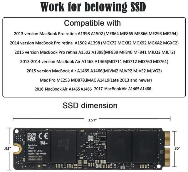 5) Package includes: 1 x USB-C to MAC SSD Enclosure, 1 x USB C to USB 3.0 Cable, 1 x USB C to C Cable, 1 x Screwdriver.