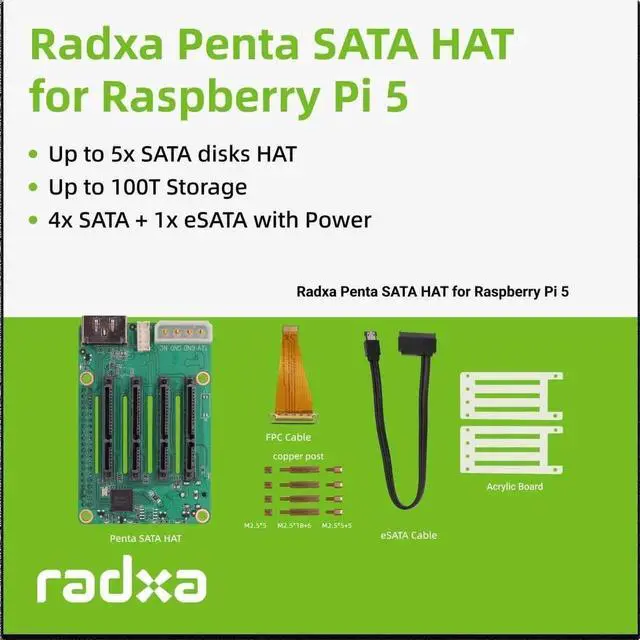 1. Up to 5x SATA disks HAT ^^ 2. Up to 100T Storage ^^ 3. 4x SATA + 1x eSATA with Power ^^ 4. External Standard ATX Power Supply or 12V DC Power Supply ^^ 5. Compatible with Raspberry Pi 5 and Radxa ROCK SBCs