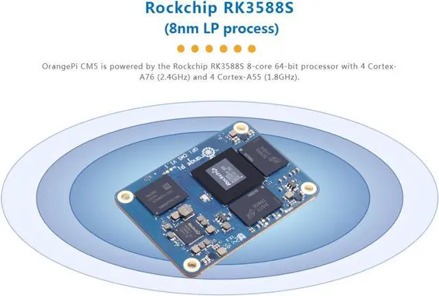 [High-Performance Processor]: Equipped with the Rockchip RK3588S 8-core 64-bit processor, Orange Pi CM5 boasts 4 Cortex-A76 cores running at 2.4GHz and 4 Cortex-A55 cores at 1.8GHz, all built on an advanced 8nm process.