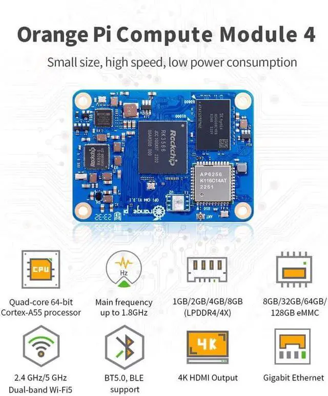 [Compact and Powerful]: Orange Pi Compute Module 4, featuring the Rockchip RK3566 quad-core 64-bit Cortex-A55 processor. Built on a 22nm process, it runs up to 1.8GHz processor. And Orange Pi CM4 is available with four high-performance memory configurations (1GB, 2GB, 4GB, and 8GB) and multiple eMMC flash memory options (8GB, 32GB and 64GB).