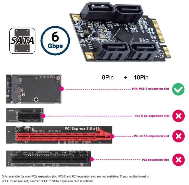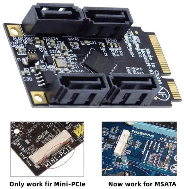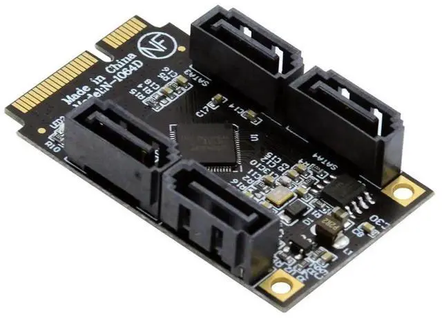 Main control chip: ASMedia ASM1064. Interface: 4 * SATA3.0 interface. Applicable slot: MINI PCI-E (mSATA is not supported)