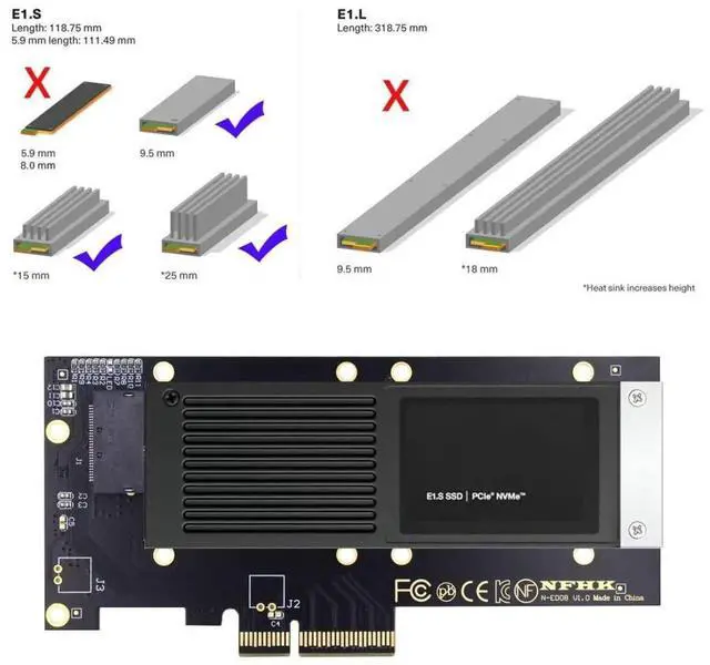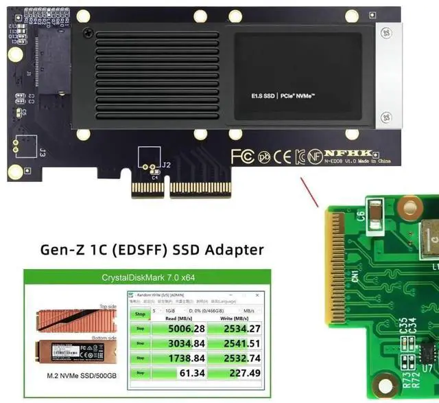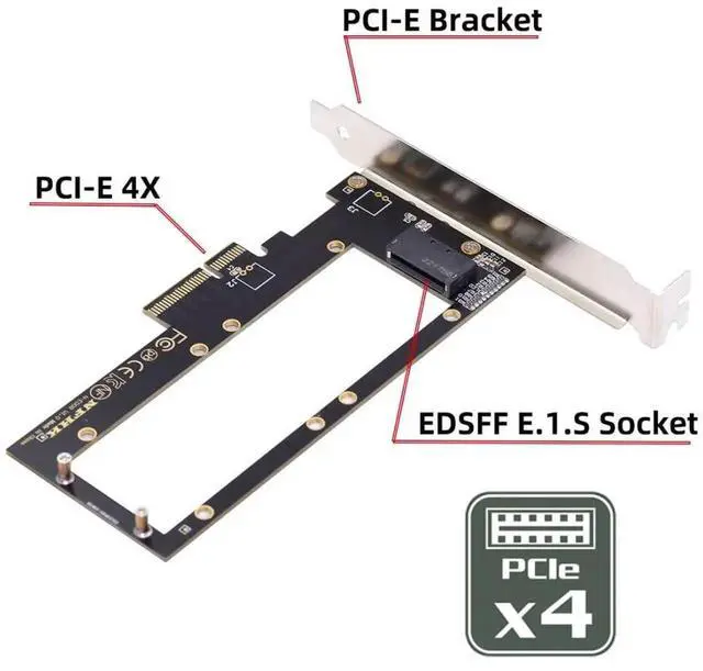 This converter enables the connection of a GEN-Z SSD in E1. S. Fit for 9.5 mm & 15mm & 25mm thickness SSD with heat sink. (like PM9A3 PM9D3 P5801X) Low profile and Regular size PCIe bracket on board. The converter can be installed into your system internally through the PCI-E 4X interface. Thus an EDSFF E1. S SSD becomes an PCI-E SSD, which can be used in IoT, data center and server area. Compliant with PCI Express 4.0. No driver installation is required. Most of the latest operating systems support PCIe-NVMe SSDs.