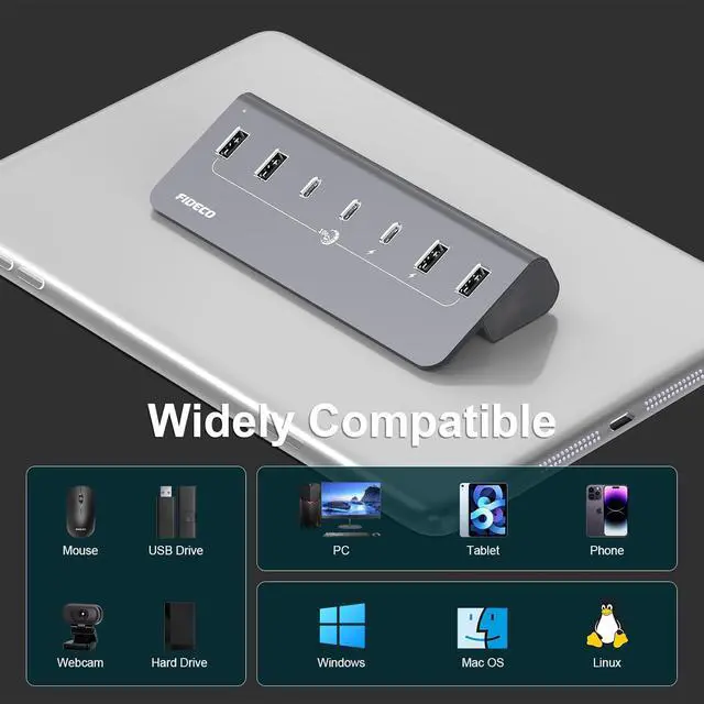 Aluminum DesignFIDECO USB hub is made of full aluminum alloy with ergonomics design to help dissipate heat quickly. The bottom of the data hub is equipped with non-slip rubber pad, which can keep more stability without scratching your desk. The USB hub can be for both practical and aesthetic purposes!