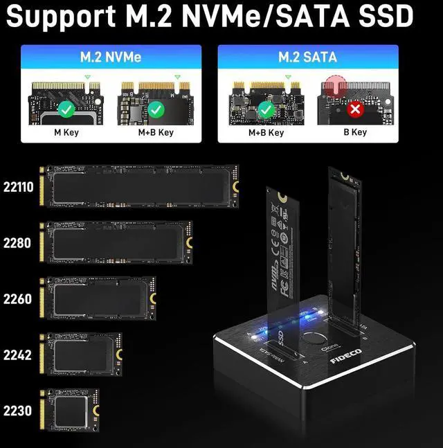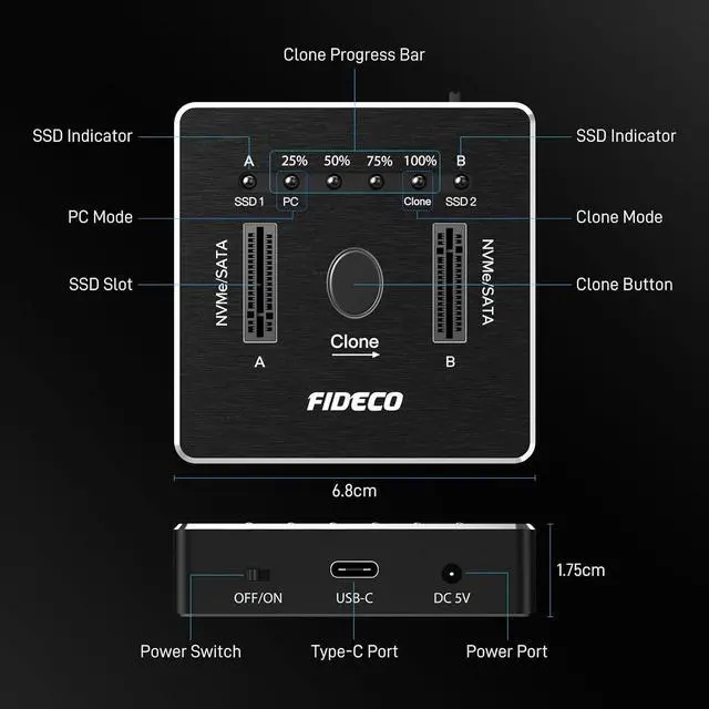 20Gbps Offline CloneFIDECO NVMe SSD cloner dock can support offline clone with 20Gbps lightning speed to save much time for you for data backup. Just insert 2 SSDs into respective slots, connect the power adapter (do not connect computer), and long press clone button for 5 seconds until 25% light is flashing blue.
