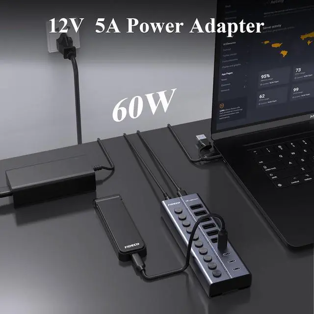 60W Powered USB HubEquipped with 12V 5A power adapter for stable and reliable powering and charging for your various devices, and the built-in surge protection can effectively protect your devices from damage during electrical storms.