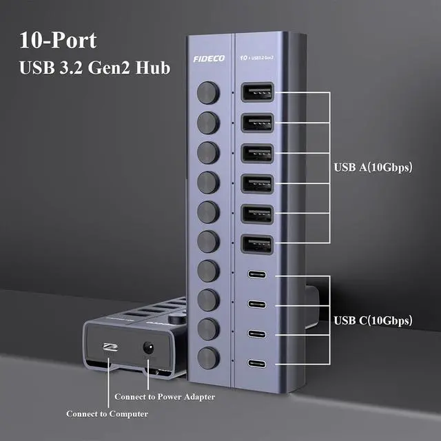 USB A and USB C PortsFIDECO USB hub for laptop is equipped with 6 USB-A ports and 4 USB-C ports, so just one USB data hub can meet your needs of connecting devices with USB A or USB C port.