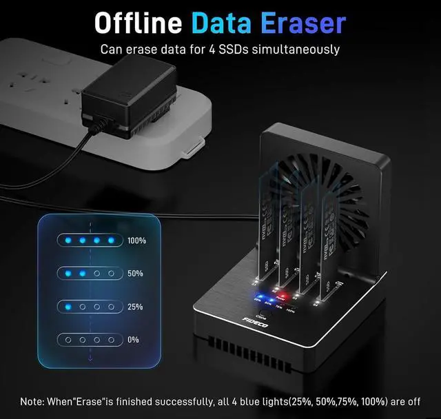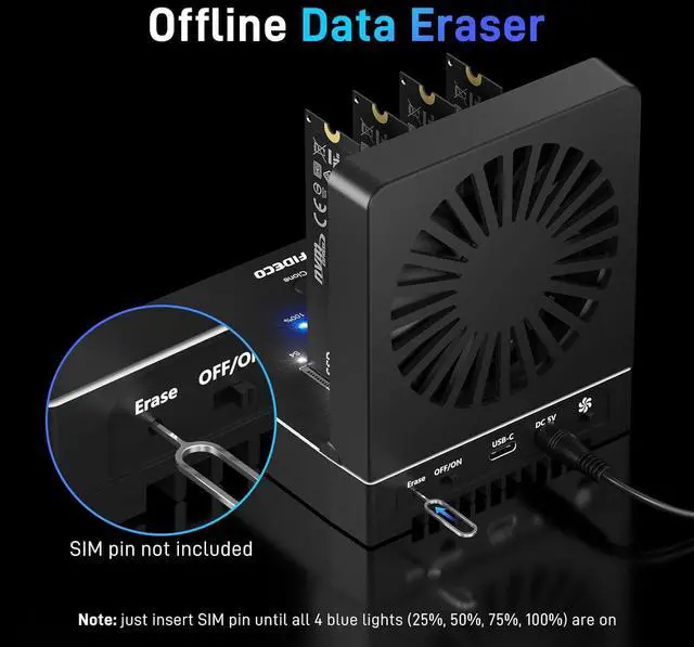 Support Offline Data EraserFIDECO NVMe dock reader can support one-button data eraser for total 4 SSDs. Just use the sim pin (not included) to long press the "Erase" button until all 4 blue lights are on. You can erase data just by inserting SSDs into this device, and do not need to connect it to any computer. It can more or less protect your privacy.