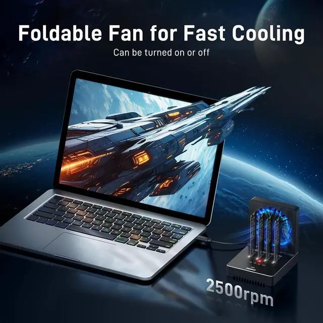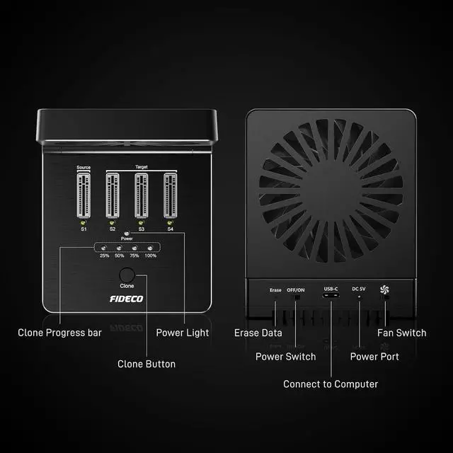 Foldable Cooling FanFIDECO SSD cloner dock is engineered with one foldable cooling fan to help cool your NVMe SSDs and make them maintain in a cooler environment. You do not need to worry about the problem of SSD overheating anymore. This device can absolutely help prolong the lifespan of your SSD.