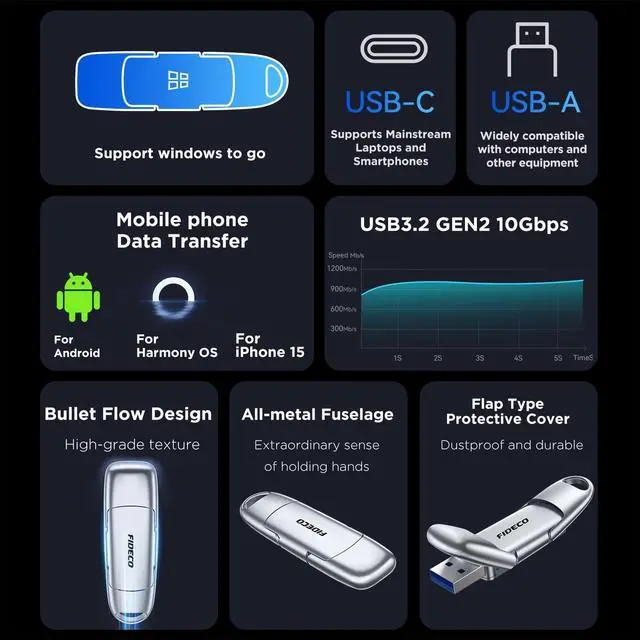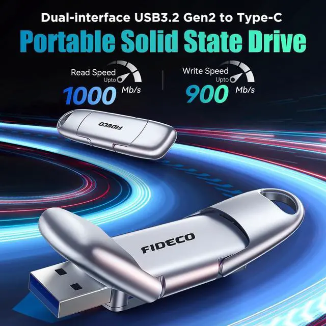USB A and USB C PortsFIDECO external solid state drive is engineered with USB Type A and Type C ports, allowing you to access your files directly with laptops and desktops or OTG-enabled phones/tablets, audio system, smart TV, etc.
