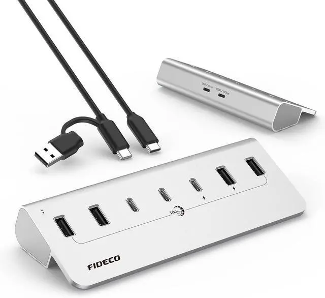 FIDECO Powered USB Hub for for Laptop, PC, MacBook, 7-Port 10Gbps USB Splitter with Power Adapter, Aluminum USB 3.2 Gen 2 Multiport Adapter, 6 USB-A and 4 USB-C Ports, Silver