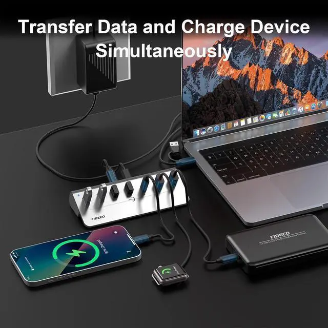 Aluminum DesignFIDECO USB hub is made of full aluminum alloy with ergonomics design to help dissipate heat quickly. The bottom of the data hub is equipped with non-slip rubber pad, which can keep more stability without scratching your desk. The USB hub can be for both practical and aesthetic purposes!